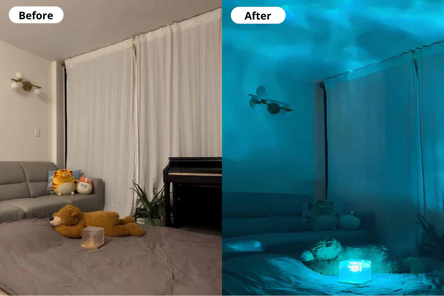 Gentle color waves resembling the aurora borealis, effectively reduces anxiety and stress. This soothing ambiance encourages creativity and emotional well-being, provideing a serene space for relaxation and rejuvenation.